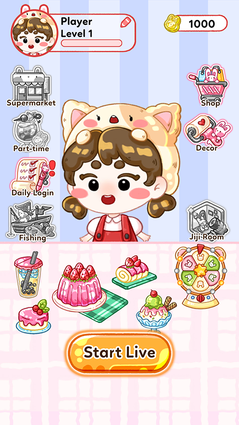 除了做果冻,你还能在虚拟超市里买各种零食,比如彩虹糖、抹茶华夫饼等等。这些小细节让游戏体验更丰富了。最棒的是可以自定义直播间,装饰成喜欢的样子,放上萌宠或者美食摆设,感觉就像真的有一个自己的小天地。