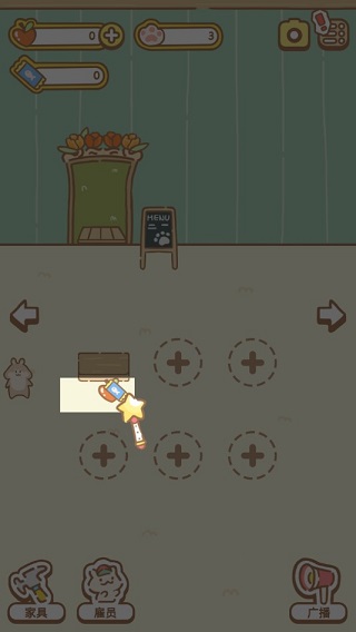 具体的招募方法,在右边休息室有一张面试桌,在那里可以雇佣员工。另外,你需要带些楚鲁果来吸引猫员工。