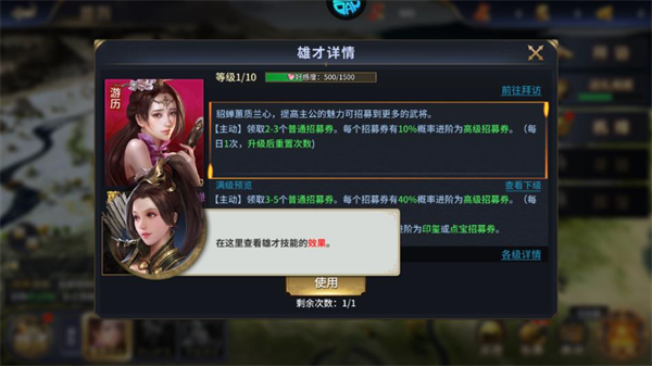 5、送礼增加好感度后可以升级雄才,雄才升级后能获得更强的效果。