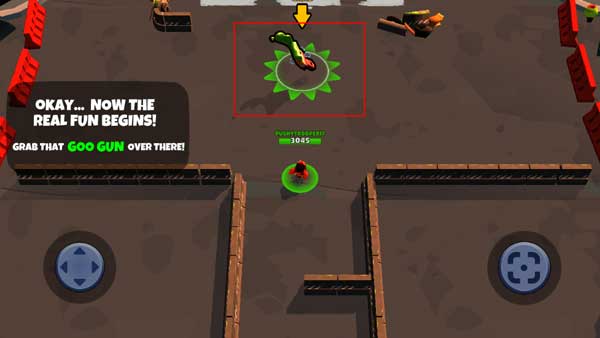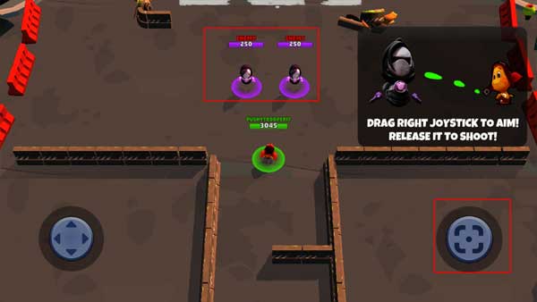1、游戏的开始会有一个简单的新手引导,玩家需要控制左边的方向键来让角色移动,右边是攻击键,其中包含飞镖、导弹和喷射颜料。