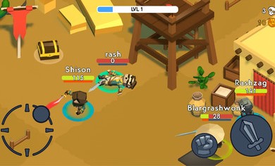 操作很简单,就是虚拟摇杆控制角色移动和攻击,但要注意躲避其他人的偷袭哦!游戏中会随机出现宝箱和道具,开启宝箱还能获得额外技能,血量不够的时候记得找药包补给。新人玩家可以多练习1V1的战斗技巧,尽量避免和太多人同时对战,这样更容易获胜。