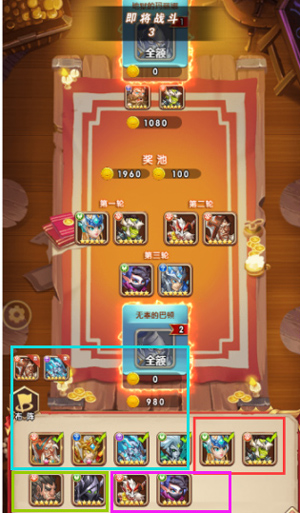 蓝色框圈的是玩家的独立英雄牌,红色框第一轮的公共牌【双方都有海妖&巨魔】,绿色框第二轮的公共牌【双方都有万兽之王&暗夜君主】,紫色框第三轮【战神&暗影刺客】