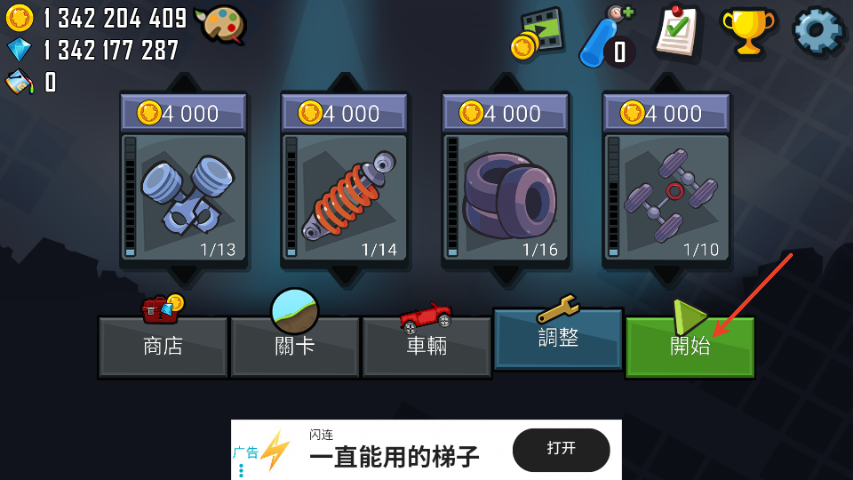 2、升级部件包括发动机、悬浮、轮胎和四轮驱动。