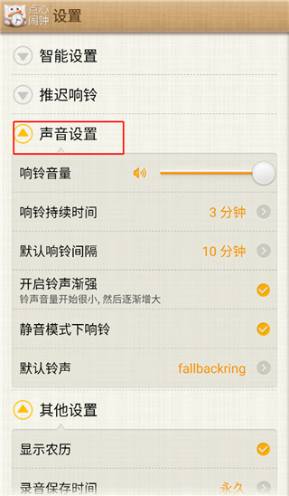 5、然后点击齿轮状图标,点击声音设置,设置好相关的音量、响铃间隔、持续时间等等即可;