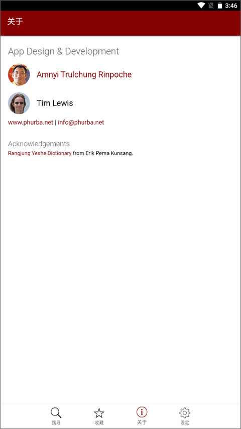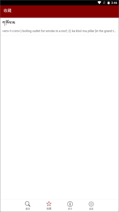 tibetan翻译软件是结合了几种词典到一个单一的应用程序,词汇和定义可以在英语和藏语进行搜索。它的界面非常简洁,其中就包含搜寻、收藏、设定这几个功能选项,用户可以通过搜寻功能找到自己想要查询的藏文,并且如果对这个词汇感兴趣的话还可以将它收藏起来,以便实时复习。此外,tibetan默认进入是藏文,大家可以根据自己的需要去设置修改为中文或者English,总体来说用起来非常的简约舒适,推荐大家下载体验!