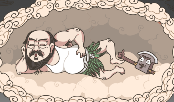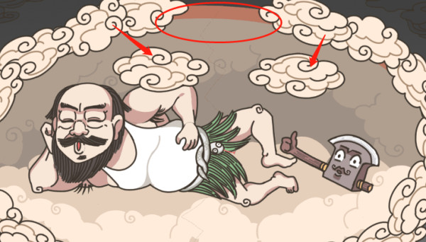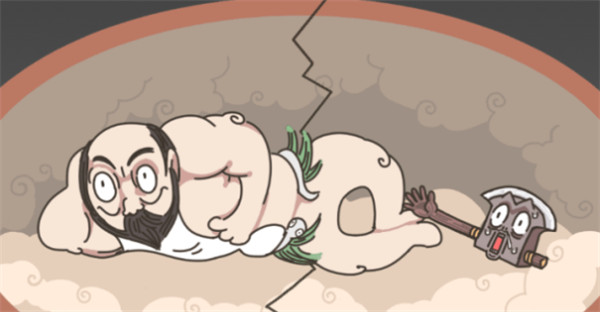进入游戏后可以看到盘古在一个云团也一样的蛋克里面睡觉,在脚边还有一把斧头,这就是开天的工具。