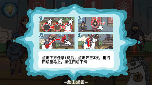 点击下方任意1马后,点击齐王3次,拖拽田忌至马上,按住田忌下滑即可。