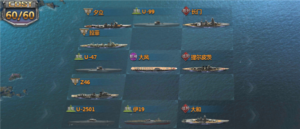 4、驱逐夕立+潜艇U-99+战列长门+驱逐拉菲++潜艇U-47+航母大凤+战列提尔皮茨+驱逐Z46+潜艇U-2501+潜艇伊19+战列大和