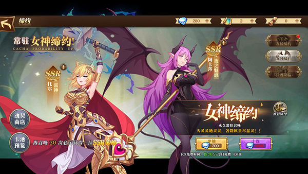 2、结束新手对话后,玩家可以到缔约系统进行女神召唤,召唤强力女神英雄,帮助你战斗。