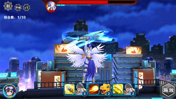 3、进入战斗后,数码兽会自动攻击,每次攻击都会积攒能量,满能量后可以选择技能卡,释放强力的数码兽技能,还有几率刷新进化技能,进化数码兽释放更强技能。
