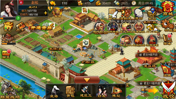 游戏中玩家所扮演的是一名君主,你需要通过战役获得君主经验、武将经验以及各种道具,以培养武将等级、搭配武器来提升队伍战斗力,升级官府、农场、矿场、军营等建筑,招募更多武将组队更多阵容体系。游戏中,玩家可自由放置战斗位置,根据位置的不同所触发的阵法也不一样,战斗效果也就随之改变。此外,还有竞技场、联盟战场、钓鱼等模式等你体验。