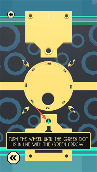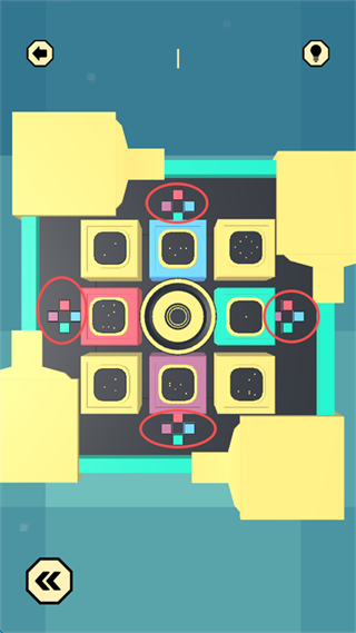 8、观察上下左右四个方向的“颜色对应方向”,并通过点击屏幕中间的“黄圆形标识”控制大型的四色方块,颜色方向对应“四周的小颜色方向”。