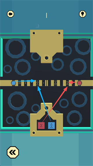 7、观察屏幕下方的“红蓝方块的空洞形状”,在上方寻找相对应的“黄点标识”,随后将相应颜色的“红蓝圆形”移动到相应的“黄点标识”。