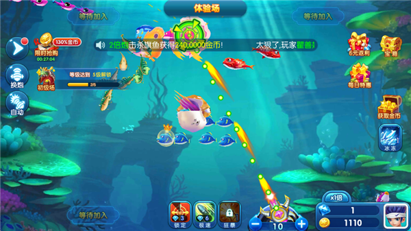 3、玩家需要选择合适的炮台等级,利用冰冻、炸弹等道具来提升捕鱼效率。