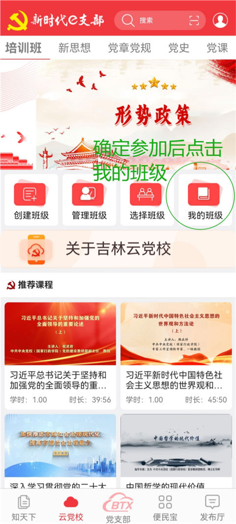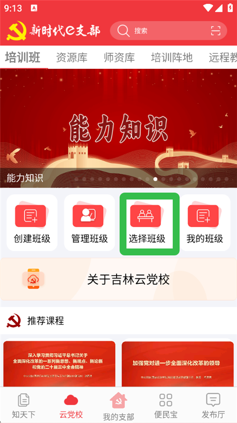 1、打开新时代e支部app,进入【云党校】页面,点击【选择班级】。