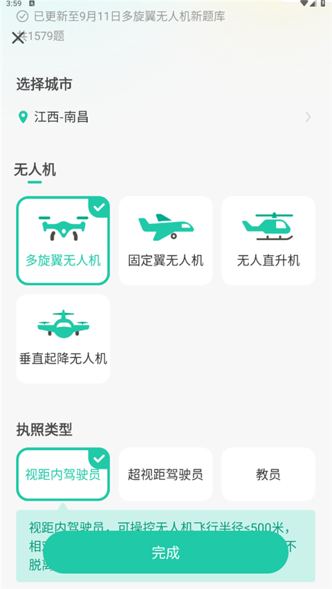 1、进入软件根据需求选择无人机类型以及执照类型。