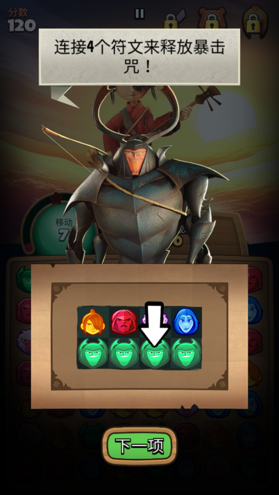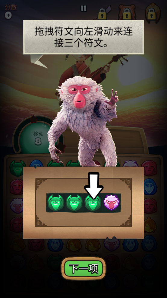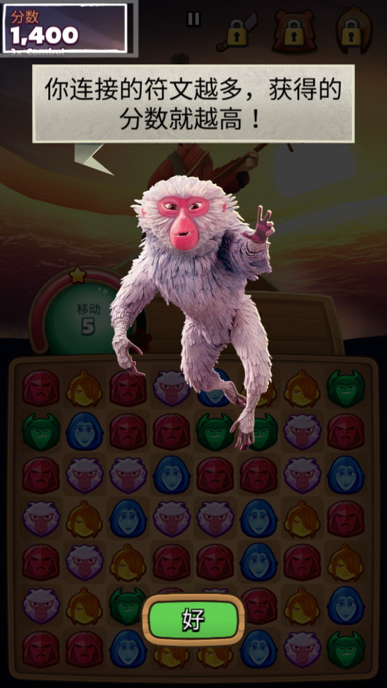 1、通过移动符文来形成连接的三个符文进行消除