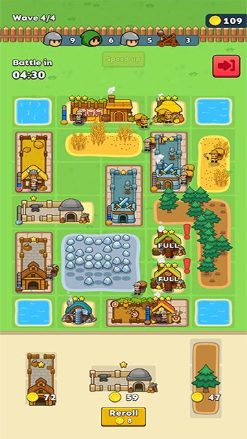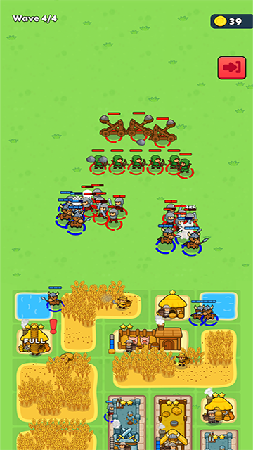 2、当房屋被放置后,会自动生成士兵与农民。农民会前往麦田收割小麦,小麦会自动转化为金币。金币数量积累到指定值后,即可解锁新的建筑设施,逐步扩展你的领地。