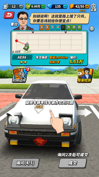 游戏特色包括丰富的车型选择(轿跑、SUV、普通轿车等)、根据车辆状况进行调整(如清洗玻璃或更换车灯)以及通过精准定价和专业知识压低购车成本。此外,还详细介绍了收车流程:从点击“收车”开始,经过关卡选择、车辆描述查看、拦截或换车、鉴定等多个步骤完成交易。