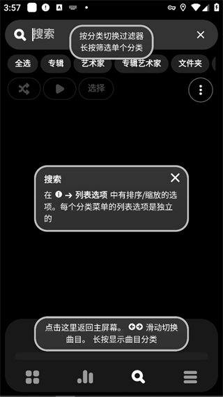 软件界面简洁直观,主页面可通过滑动切换曲目或分类,下滑即可查看更多内容。搜索功能支持排序和缩放,每个分类都有独立列表。设置选项丰富,包括查看帮助和调整音频输出参数等。