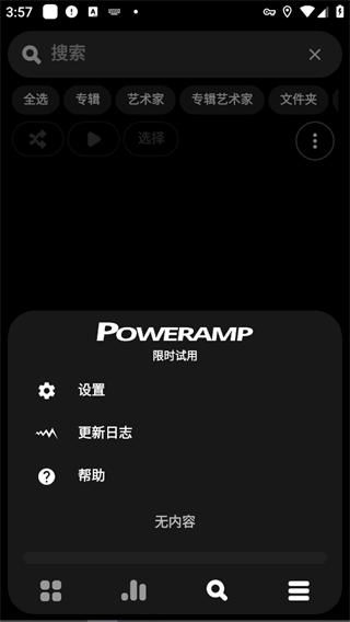 Poweramp拥有最新音频引擎和DSP技术,支持高保真输出、多种音效模式以及最新的重采样器和抖动选项。界面设计时尚,提供浅色和深色皮肤选择,并兼容第三方皮肤。底部迷你播放器方便操作,用户可快速返回主界面或切换曲目。