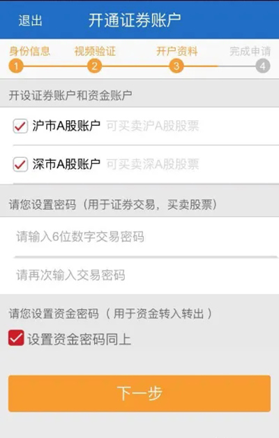 7、开通证券账户,默认勾选沪市A股账户和深圳A股账户,默认勾选资金密码和交易密码相同。请根据需要勾选需要开立的证券账户,并根据提示设置资金密码和交易密码。