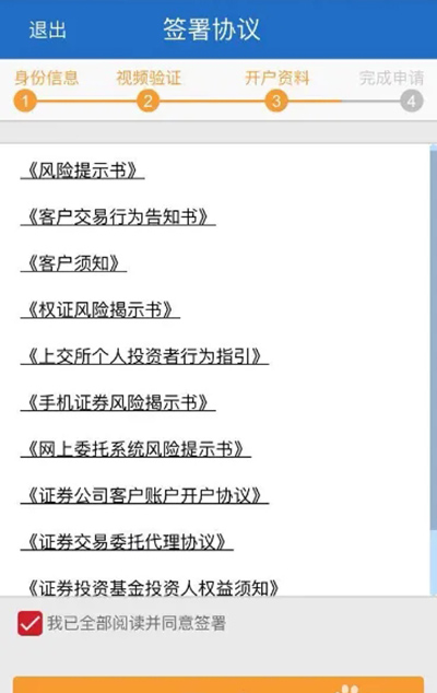6、协议签署,用户可以点击每个协议查看协议内容,阅读并同意所列出的所有协议后,勾选“我已全部阅读并同意签署”,点击“下一步”进入“开通证券账户”。