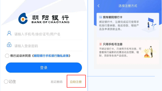 下载手机银行后,在【自助注册】中选择注册方式: