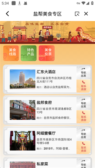 4、这里提供美食路线、特色产品、美食投票等板块,随后点击导航出发