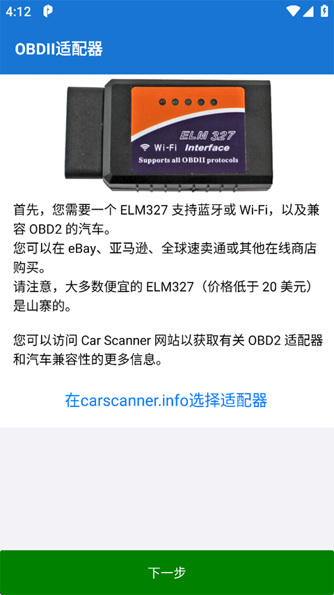 2、Car Scanner 需要一个基于ELM327芯片的OBD2适配器才能运行。