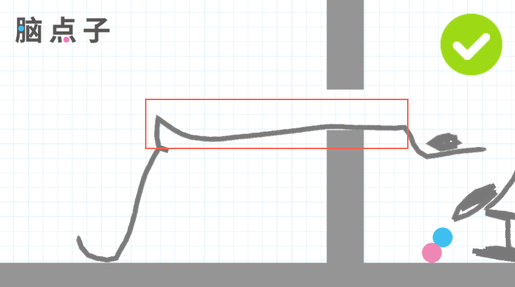 下面红框中的线虽然丑,但是比网上的实用多了,大家在过关的时候也可以画一个这样的带有弯曲的线,然后右边的重物可以轻点,只要把球弹到上面的曲线上简单了。