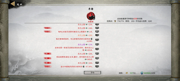 强化选择:3个减武技CD,两个概率(破势武技概率比较低),绝技需求数减少(羽化中后期也强化这个),使用飘渺之力后伤害暴击有50%概率为绝技充能,飘渺之力持续时间+2s。