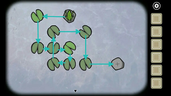 1、在大门右侧湖面点击青蛙,按照正确路线依次跳过所有荷叶,最后停在石头上,即可获得第一只青蛙;