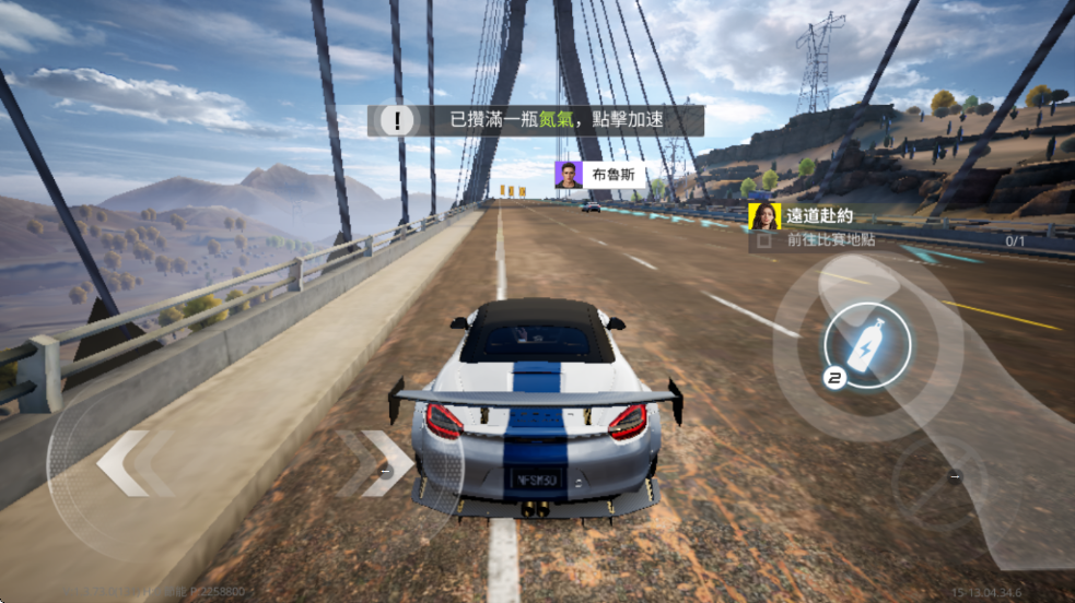 3、氮气键可瞬间激活加速功能,让赛车提速冲刺,体验极速快感。