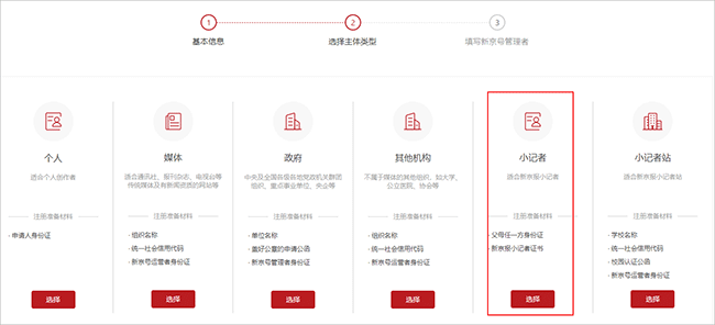 3、请小记者家长在“选择主体类型”中点击选择“小记者”。