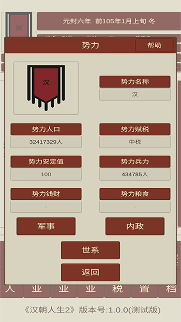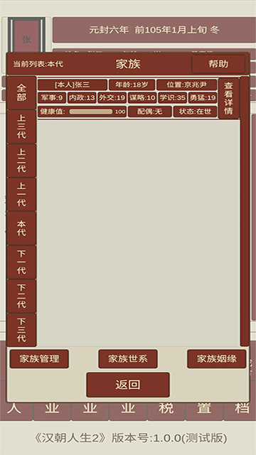汉朝人生2游戏通过细腻的文字叙述,辅以简洁界面,构建出一个可沉浸体验的古代生活图景,让玩家感受历史脉动与家族兴衰。