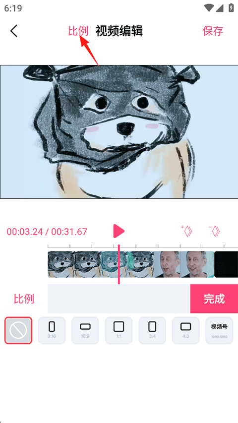 3、上传素材后来到视频编辑页面,点击比例可在下方修改视频比例;