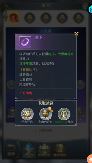 吸收魂环可以获得强力魂技,魂环年份越高战斗力越强,每种武魂都拥有限定魂环,吸收限定魂环可以大幅度提升魂技效果,限定魂环只能由对应的武魂吸收,武魂进阶可以解锁更多魂环孔,星级魂环可以进行强化,提高魂环年份,强化材料通过魂环分解获得