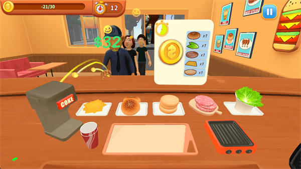 手机版玩法简单,有沙盒模式和关卡模式。制作食物后,点击汉堡递给顾客就能完成订单。顾客满意程度直接影响收入,达到一定条件还能解锁新品。最近的更新优化了游戏内容,体验更流畅。