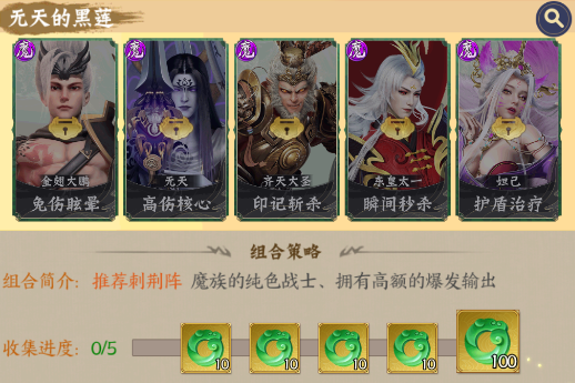 阵容组成:金翅大鹏、无天、齐天大圣、东皇太一、妲己