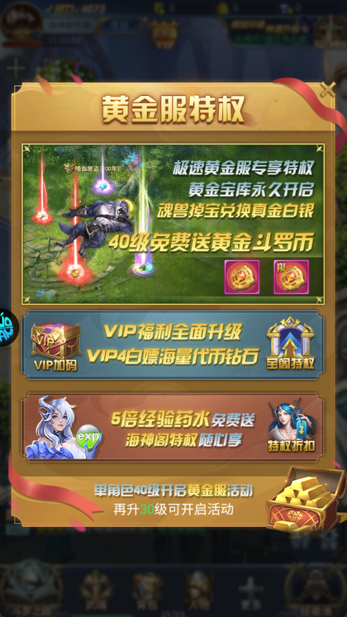 5、单角色40级开启黄金服活动再升30级可开启活动