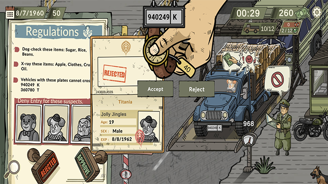 玩家将面临各种挑战,包括检查护照、签证、身份证等证件、检查车辆和行李、识别假证件,并时刻警惕走私。不同的任务复杂程度会逐渐增加,需要玩家更仔细地分析和判断。