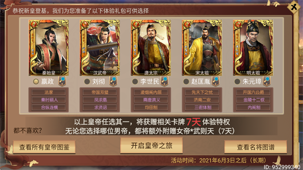 进入游戏,可从秦始皇、汉武帝等多位帝王中任选其一,还能额外获得女帝武则天7天体验特权,选好后开启皇帝之旅。