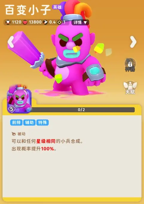 百变小子,可以说是一个让玩家又爱又恨的角色,能够和任意相同星级小兵合成的被动让他往往能快速将场上小兵星级拉高,但是合成后随机产出小兵也常常能合出其他没用的小兵
