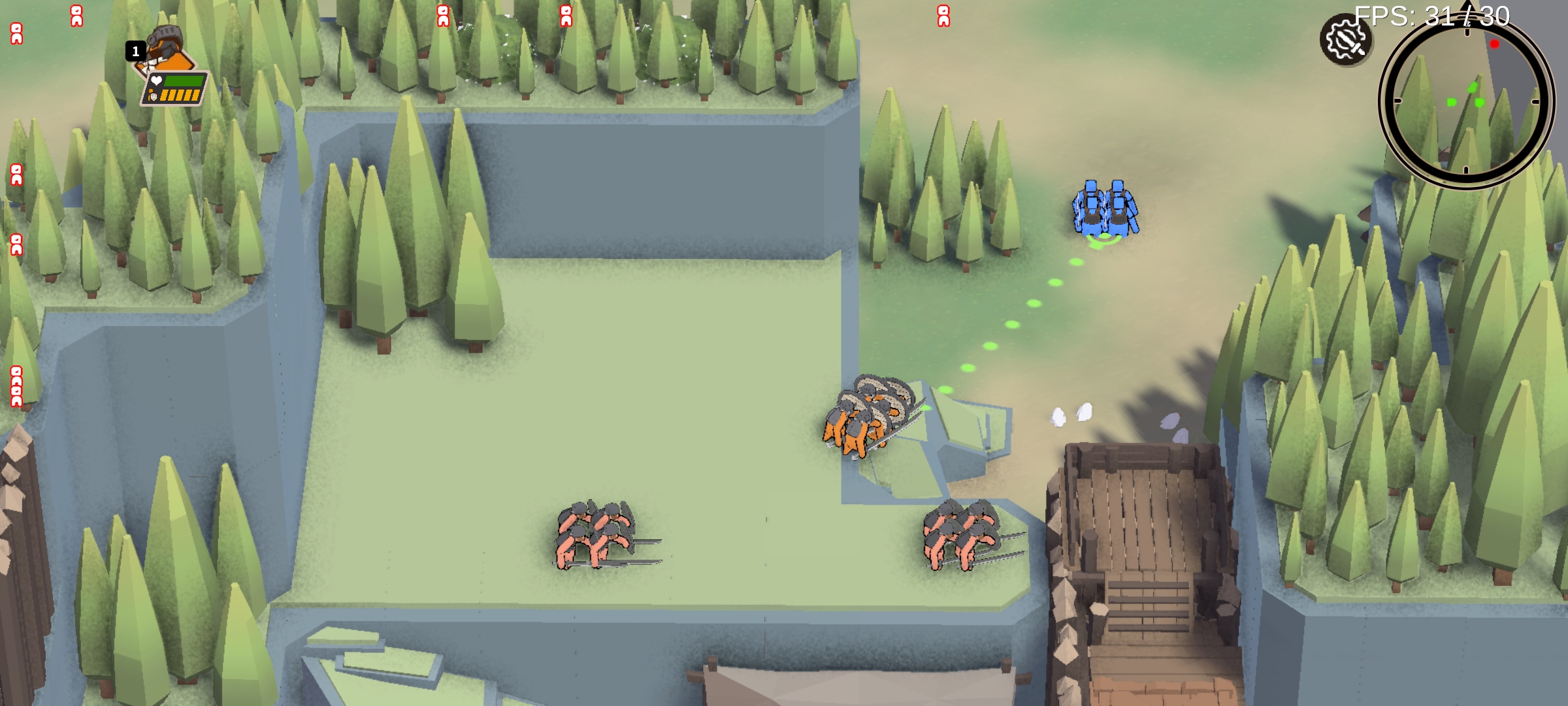 1、选择橙色前锋营军队,点击目标地点(虚线区域代表可移动范围)。