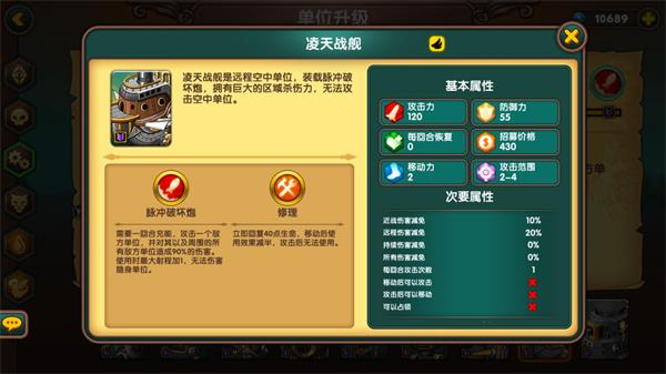 战舰,伤害高,飞行单位,坦度也高,但和坦克一样,不能对空,打兵还是两下一个,不灵活,价格也高,一般用不到。不过技能在打电脑时挺好用(憨憨电脑站着让你随便炸)但也就在特殊地图或者难度高一些的图里用,其他图还是不如飞侠(因为移动后不能攻击,更适合防守,推进还是飞侠香一些)