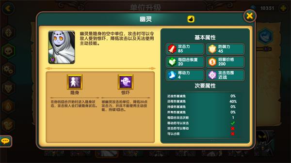 幽灵,幽灵同时具备了隐身和飞行这两个属性,让他可以轻松穿越敌军防线,攻击后排。自身攻击虽然比较低,不过惊吓加上40%的远抗绝对是后排的噩梦,对一些十分依赖技能的单位的威胁也很大(气球法师吸吸飞侠鸟)。作为工具人用来卡位,辅助进攻效果很好