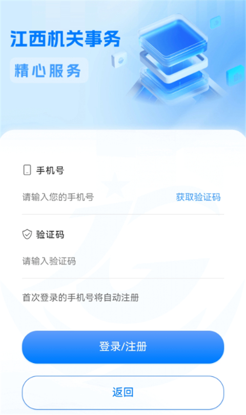 1、进入“江西机关事务App”登录注册页面后输入手机号,首次登录将自动注册。