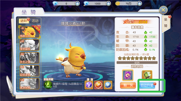 为自己的坐骑升级,可以提升攻击、生命、防御等属性加成。