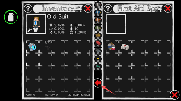 4、急救箱是一个容器,需要花费时间打开,随后点击屏幕中间下方的箭头,可以一键将急救箱中的物品直接转移到自己的背包。